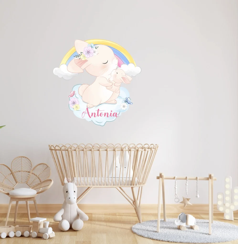 Acest sticker nu doar decoreaza, ci și personalizează spațiul într-un mod unic. Imaginea iepurșului pe norișor, alături de numele copilului, creează o atmosferă de basm.