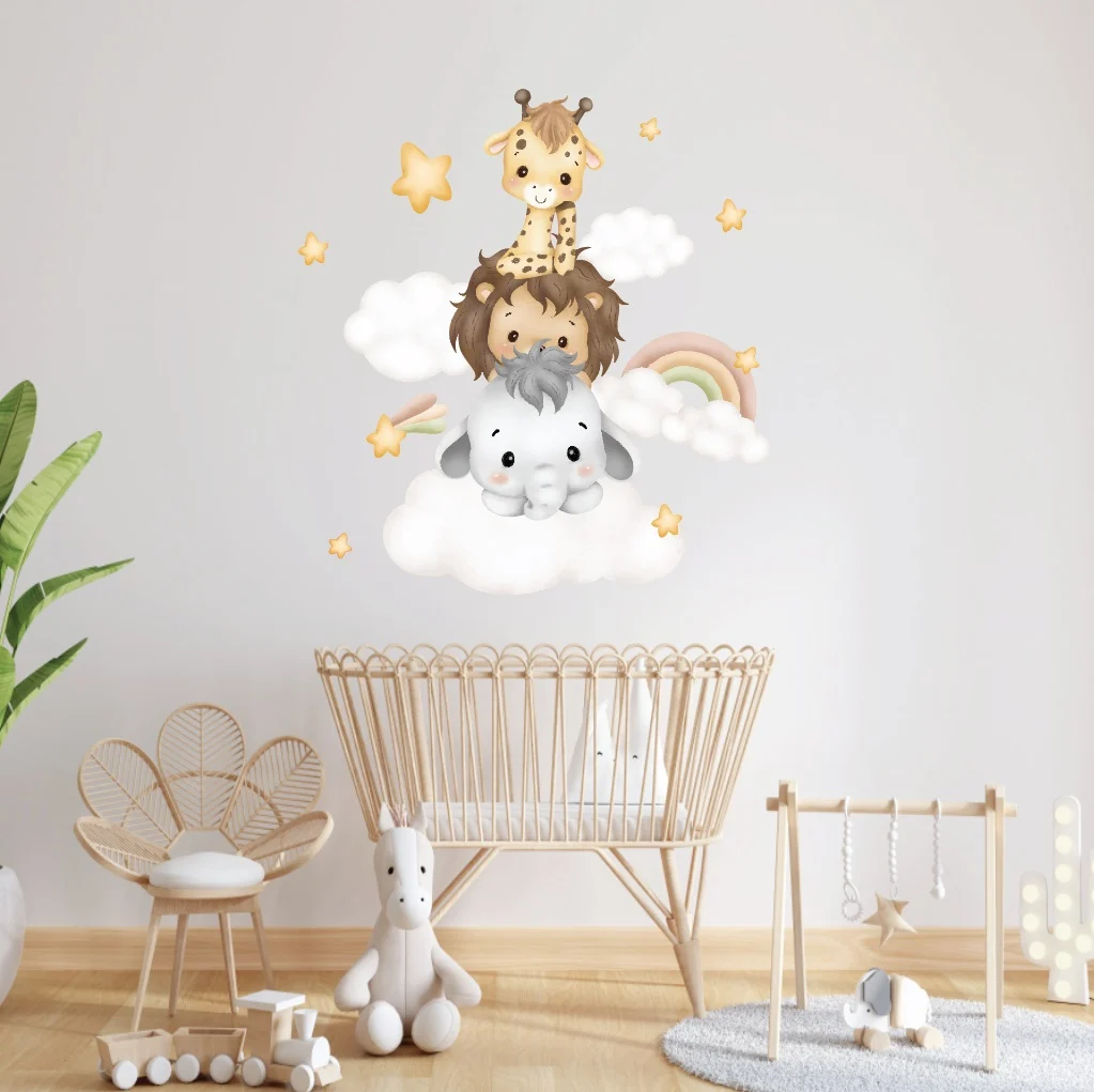Adaugă un strop de farmec deasupra patuțului cu acest design pufos și moale. Sticker-ul de perete pentru copii „Animale pe Norișori” este perfect pentru zâmbete zilnice și nopți pline de visare.