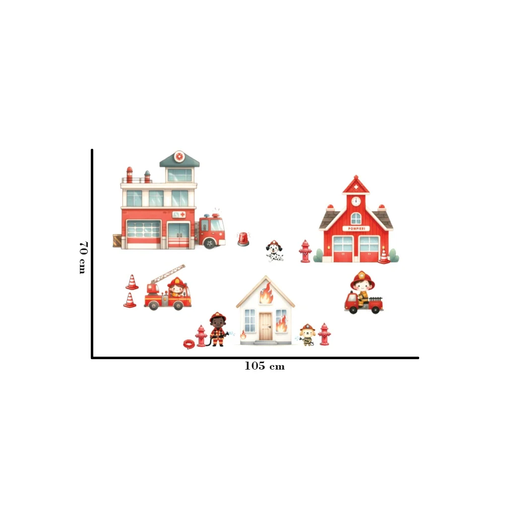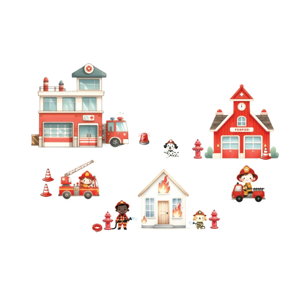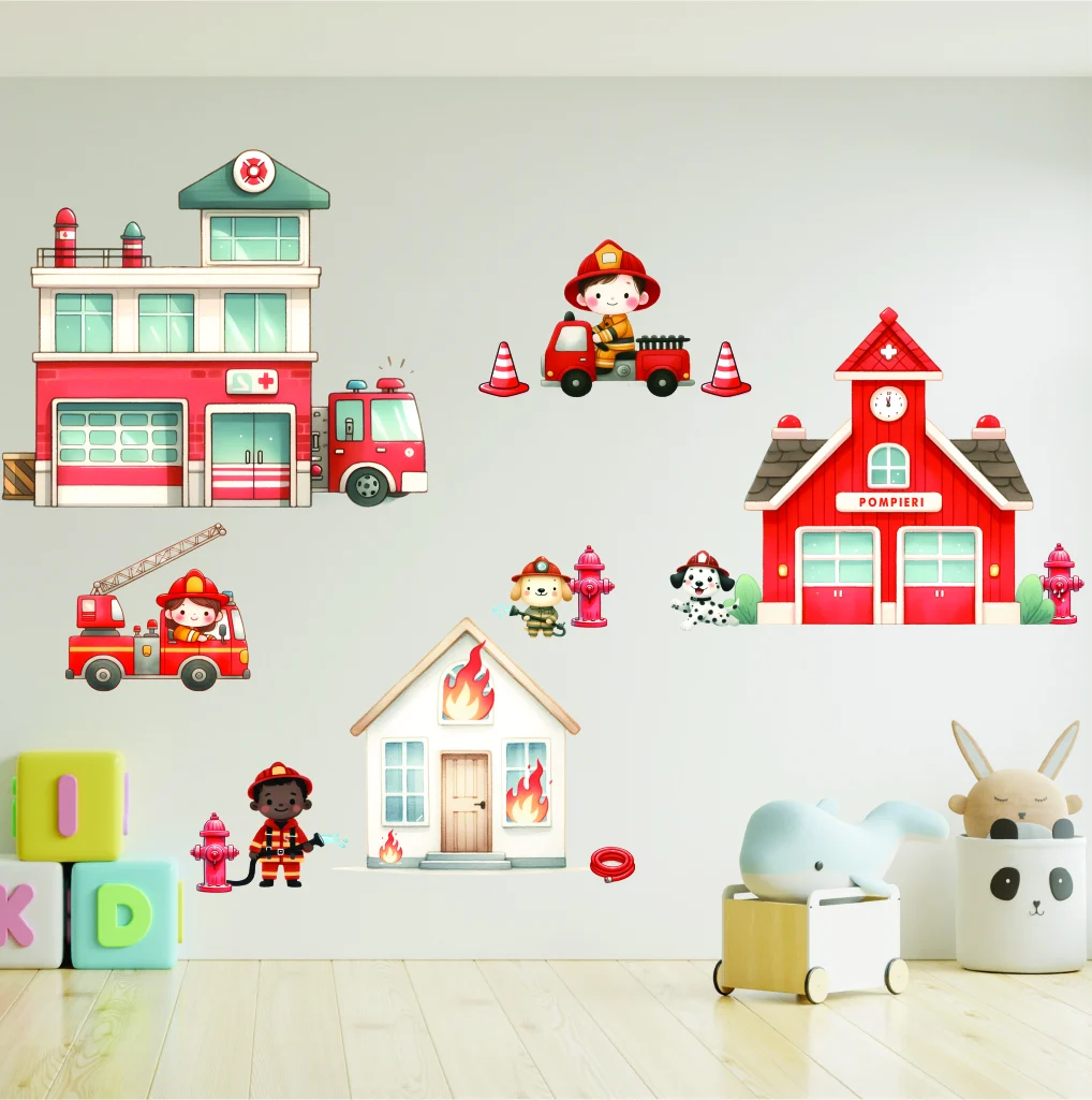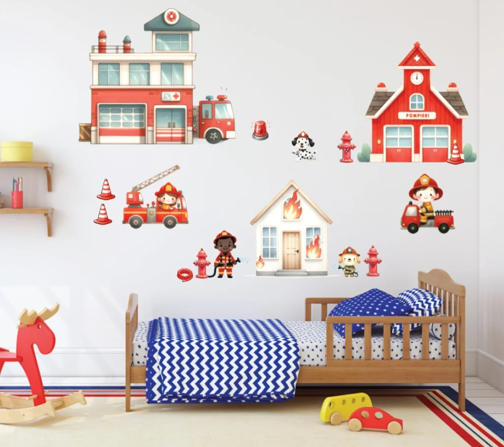 Sticker perete copii Pompieri: oferă copiilor o imagine prietenoasă asupra eroismului pompierilor.