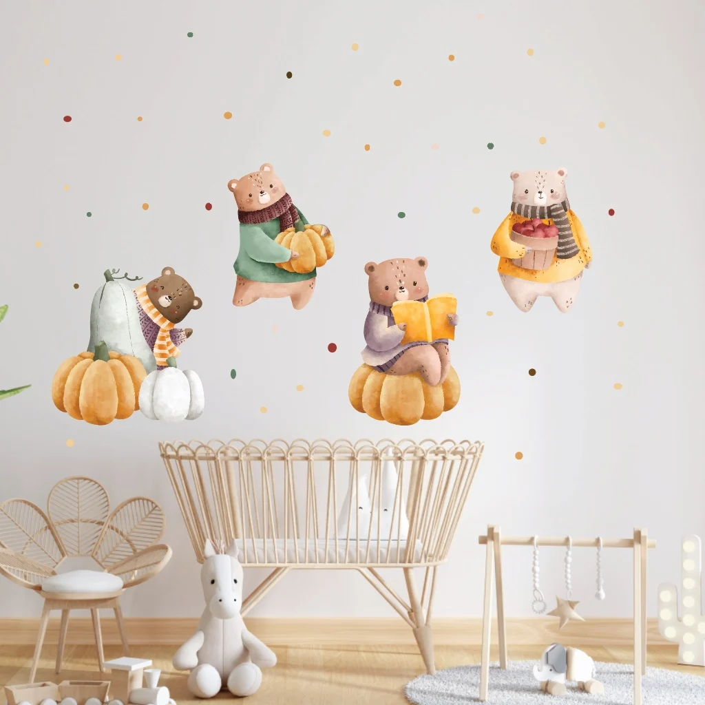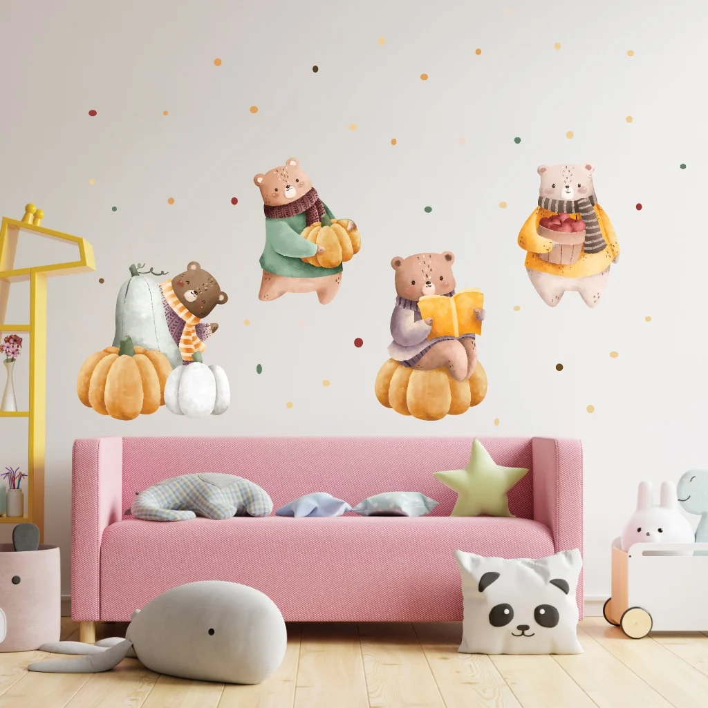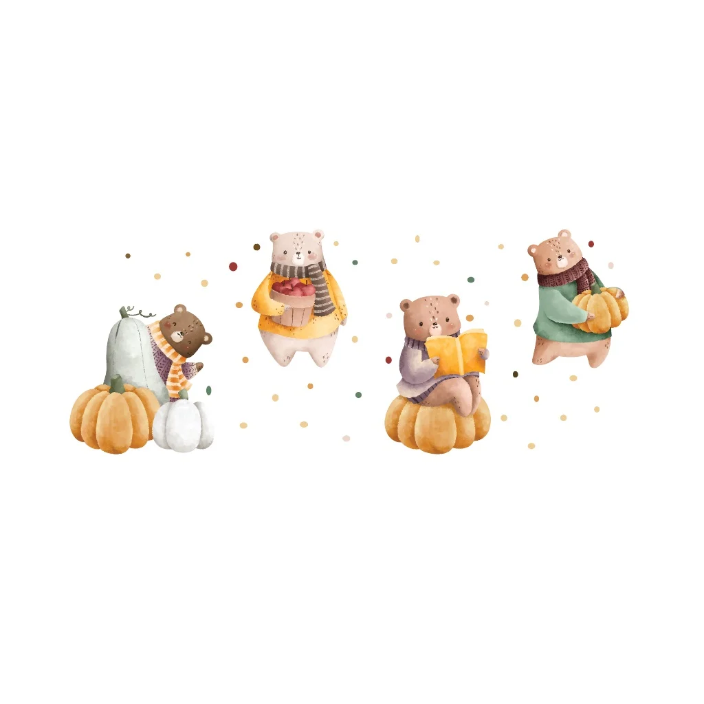 Sticker perete copii Ursuleti si Dovleci: adaugă o notă veselă și educativă despre toamna, perfect pentru orice spațiu al copiilor.