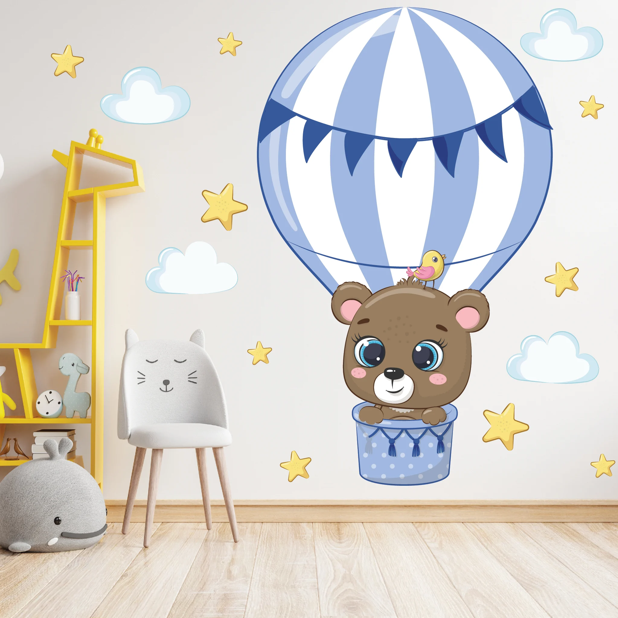 Sticker Perete Ursulet Albastru te introduce într-un univers de basm, în care un ursulețul adorabil plutește într-un balon cu aer cald.