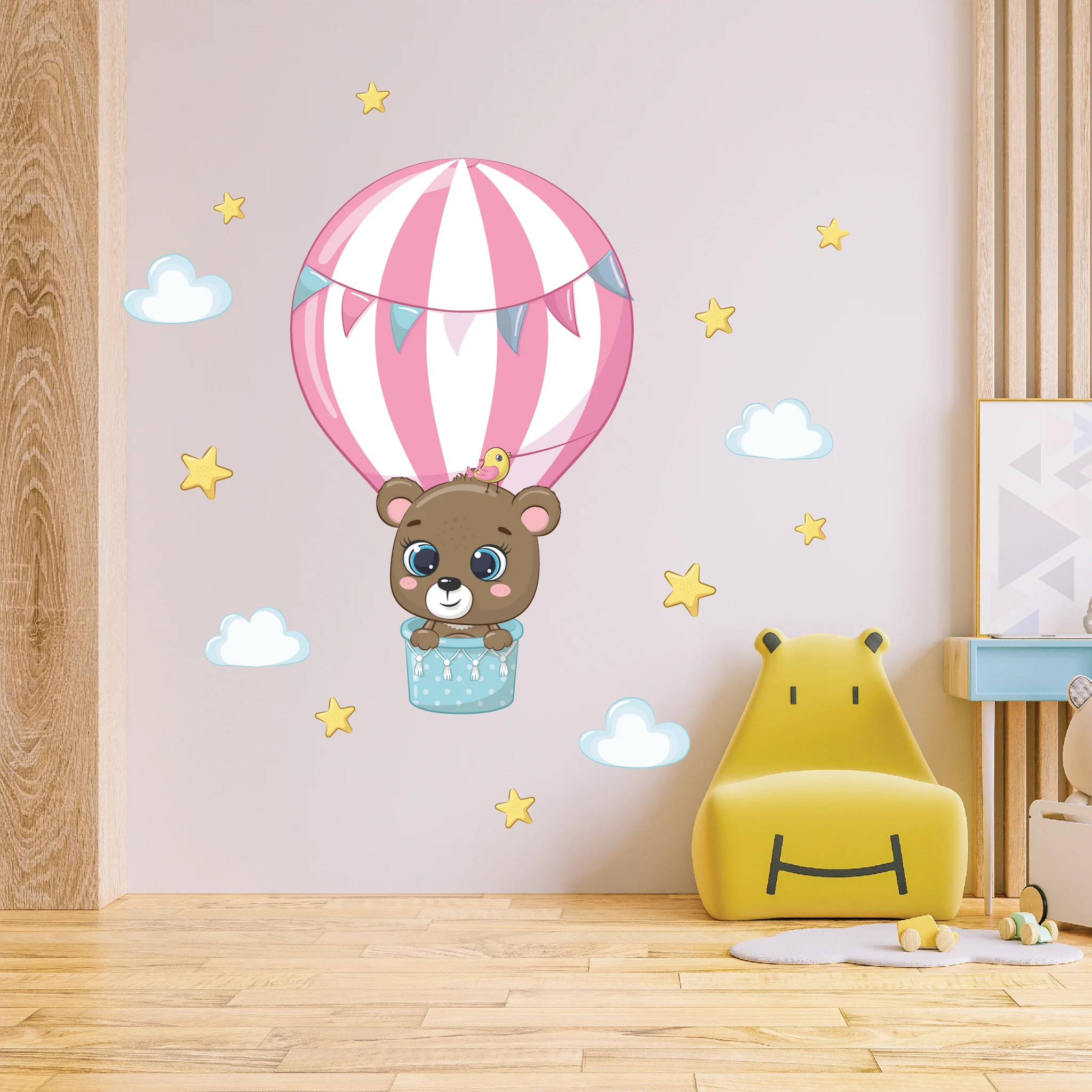 Sticker Perete Ursulet Roz te introduce într-un univers de basm, în care un ursulețul adorabil plutește într-un balon cu aer cald.