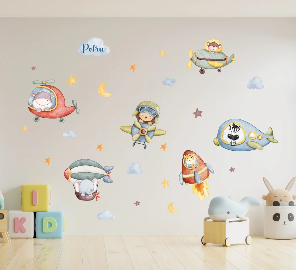 Înfrumusețează camera cu acest sticker personalizat, unde magia aviației întâlnește visarea printre nori și stelute. Colorat și plin de farmec.