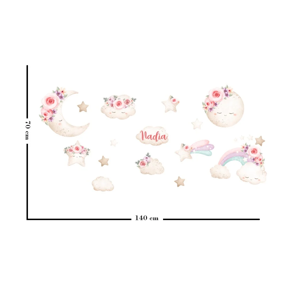 Înfrumusetează camera cu sticker personalizat nume fete luna, unde magia dansului întâlnește visarea printre nori și steluțe. Colorat și plin de farmec.